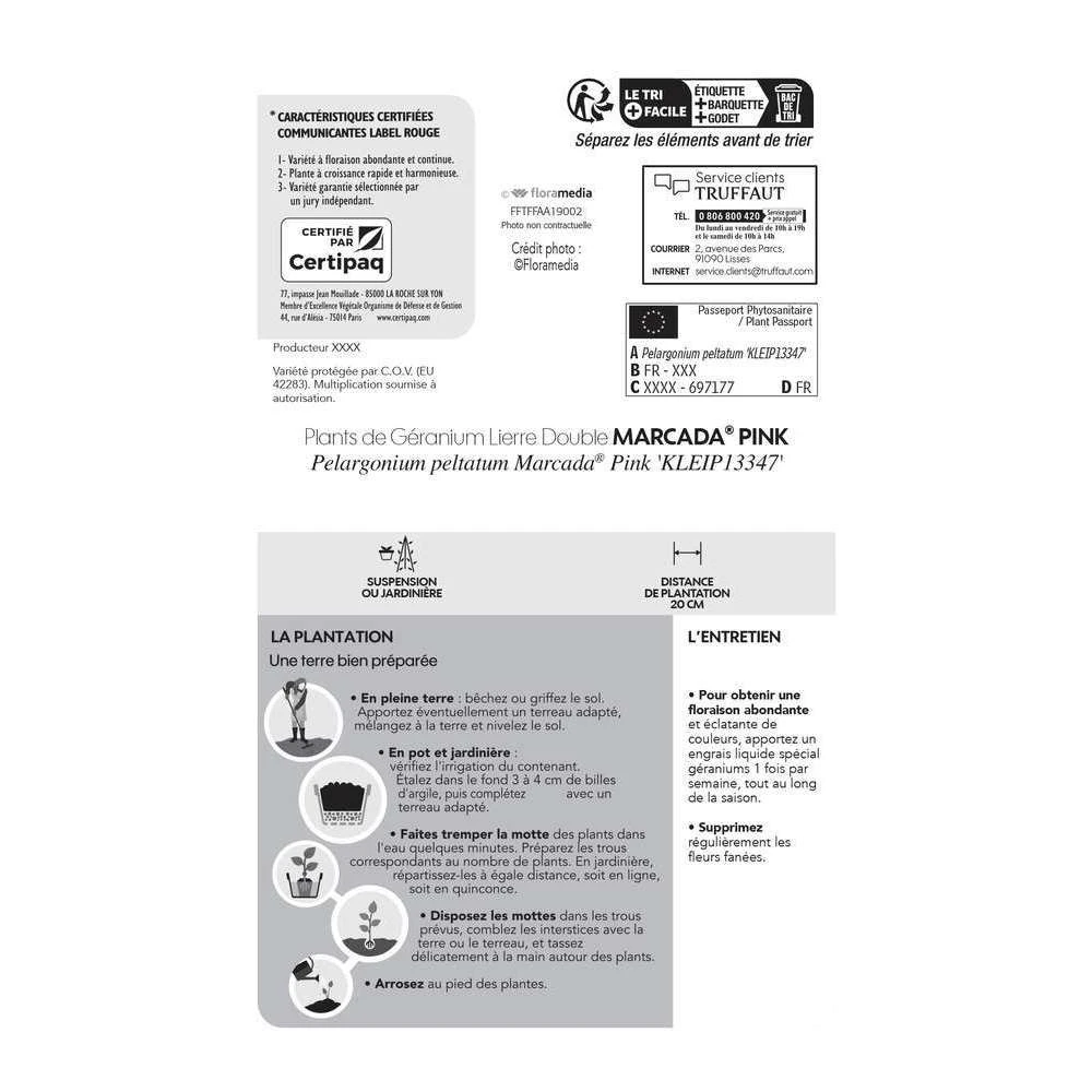 Les géraniums lierre à fleurs doubles ont des tiges grêles, souples, retombantes portant des feuilles vernissées ressemblant à celles du lierre. Les fleurs, doubles sont groupées en fausses ombelles sur de petits pédoncules, nombreux coloris unis ou panachés, blanc, rose, rouge, mauve, violet, pourpre etc…… en différentes nuances.